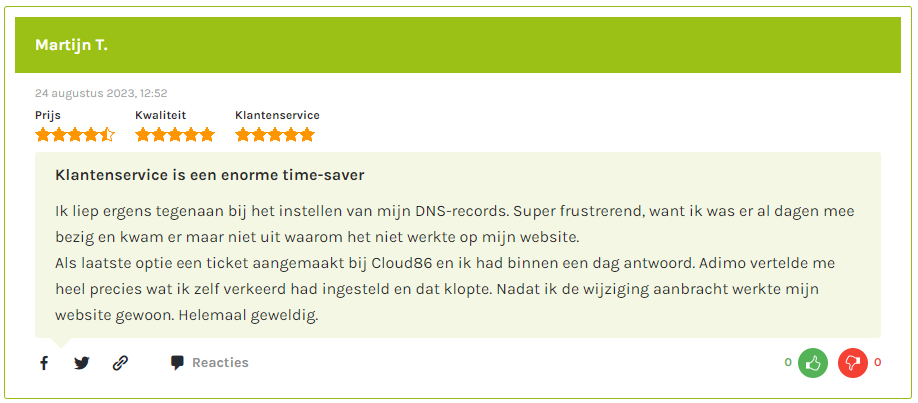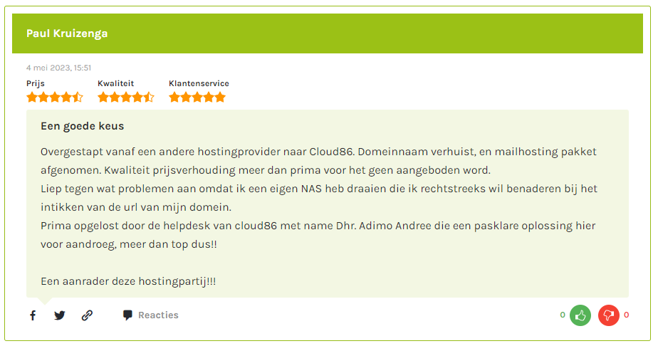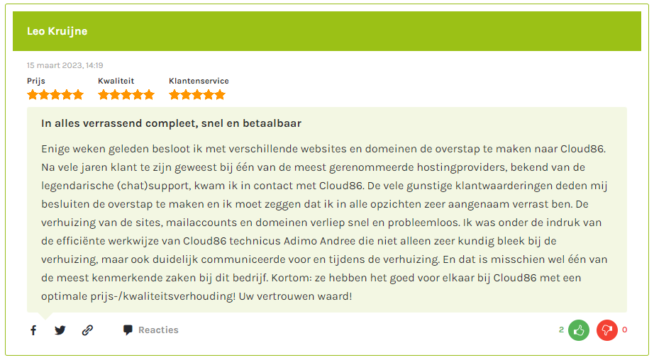 Cloud86 is de best beoordeelde webhoster op hostingvergelijker.nl en onze klanten zijn zeer tevreden over de kwaliteit van onze service en diensten.